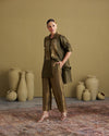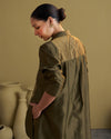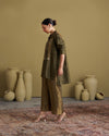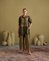 This chic, sophisticated Olive Green set is handcrafted in luxurious Silk Chanderi with shimmering Banarasi Reshmi Tissue and intricate sequin handwork.