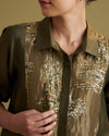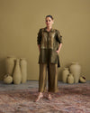 It features a contemporary shirt silhouette and coordinated pants, designed for a comfort fit that is both stylish and incredibly comfortable. The deep olive hue and subtle embellishment offer glamour without being over-the-top.