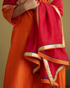 The ensemble is completed with pants and a striking contrasting red Silk Chanderi dupatta. This simple yet elegant outfit is an ideal choice for festive occasions, pre-wedding ceremonies, and celebratory gatherings, offering a brilliant splash of colour and timeless style.