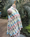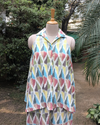 Brighten your wardrobe with this lively Halter Top, featuring a colorful diamond Ikat print in pastel shades of blue, yellow, and pink. It boasts a sharp shirt collar and a relaxed, breezy fit. Perfect for high-summer elegance, this sleeveless top pairs beautifully with white linen or the matching patterned pants.