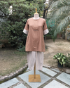 Embrace comfortable elegance with this Earthy Brown Co-ord Set. The tunic top features a refined ban-collar, three-quarter sleeves with striped cuffs, and subtle front embellishment. Paired with soft, striped draped trousers for a modern silhouette. Crafted in breathable fabric, this set is perfect for sophisticated daily wear.