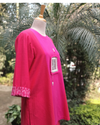 Make a statement in this vibrant, dual-toned fuschia tunic featuring striking vertical panels. The comfortable cotton blend and three-quarter sleeves are complemented by an artistic patch with delicate embellishments on the front. Paired with matching trousers, this set is perfect for a contemporary, festive look.