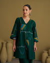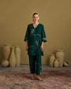 Fresh, vibrant, and artisanal, this Panna Green handwoven cotton set shows traditional craftsmanship with a contemporary sensibility. The kurta is fused with handwoven Ikat and delicate handwork, creating an intricate play of patterns and textures that adds depth and character to the ensemble.